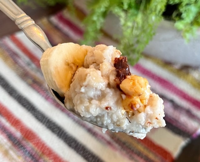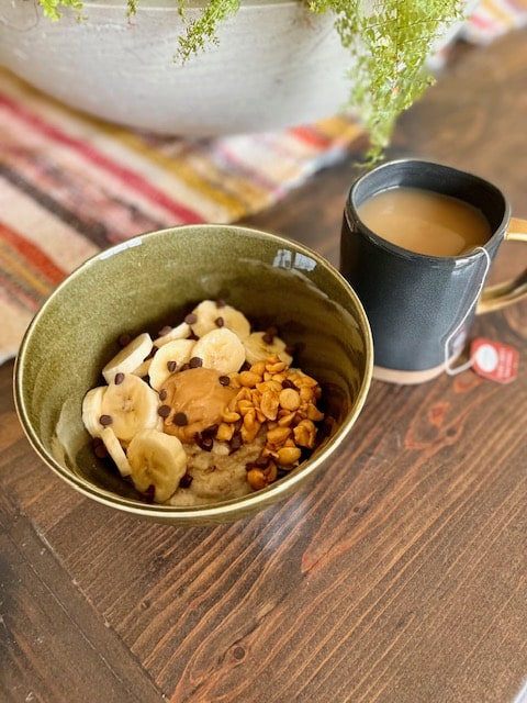 4)  When oats are cooked, stir in the nut butter and transfer to a bowl.