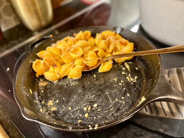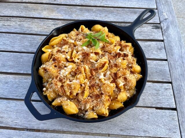 4) Use pure olive oil to grease a cast iron skillet or casserole dish. Put mac n’ cheese in dish, sprinkle with bread crumbs and red pepper flakes and bake uncovered in the oven for 15 minutes or until bread crumbs are brown (keep checking).